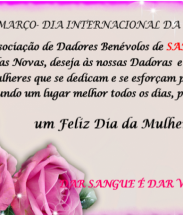 Neste dia 8 de março, dia Internacional da MULHER a ADBSVNOVAS deseja a todas as mulheres que lutam por um mundo melhor todos os dias , um Feliz Dia da Mulher, e que esta felicidade perdure pelos restantes 364 dias do Ano. PARABÉNS MULHERES Pela ADBSVNOVAS O Presidente da Direção Virgilio Augusto Teixeira